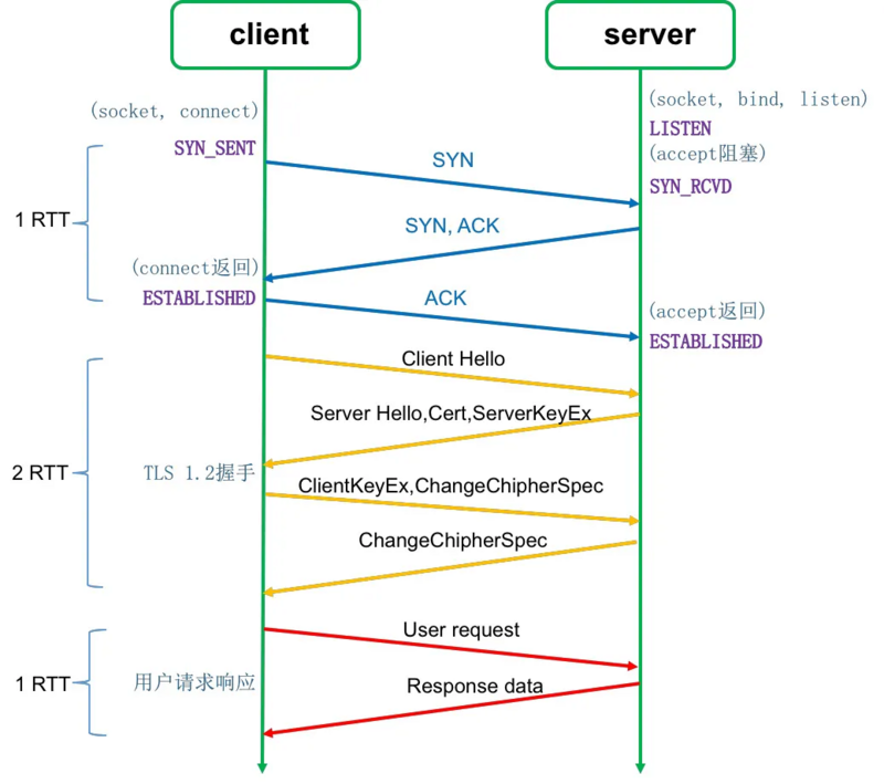 接下来是TLS的握手操作,就以当前使用最为广泛的TLS1.2来说,四次TLS握手需要消耗完整的2个RTT;