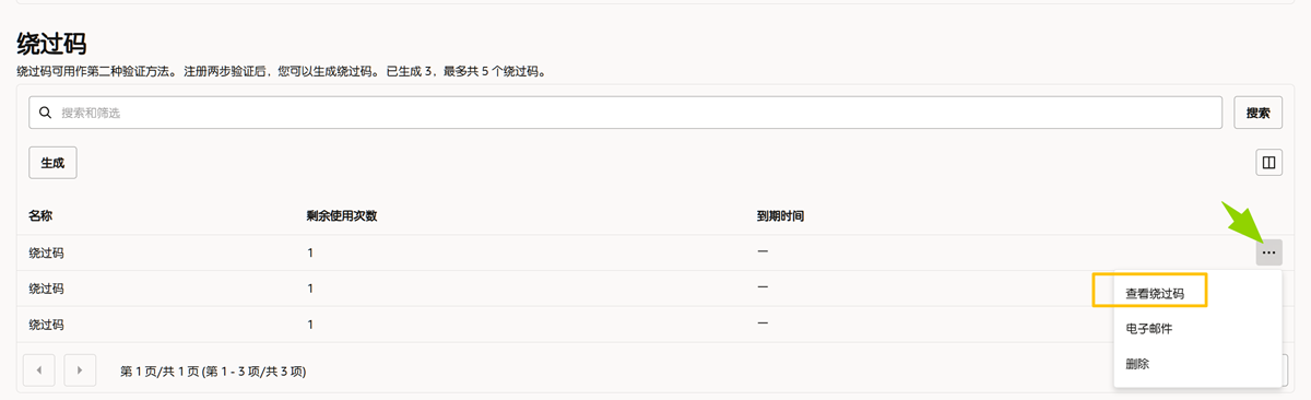 成功登录甲骨文云控制台后,点击右上角【个人图标】,进入【用户设置】,选择【安全】选项卡,将页面拉到最下面的【绕过码】标签,点击【生成】按钮即可生成1个绕过码,点击【复制】存档。